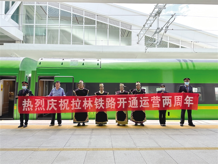 2021年6月25日,拉林鐵路開通運營,結(jié)束了藏東南不通鐵路的歷史,復(fù)興號動車開到西藏,駛上拉林鐵路,拉薩至山南、林芝最快1小時4分、3小時30分可達;山南至林芝最快2小時22分可達,相比汽車,從拉薩到林芝的時間幾乎節(jié)省了一半,從山南到林芝,也節(jié)省了2個多小時。兩年來,隨著運行方式逐漸成熟,鐵路方便、快捷的運輸優(yōu)勢逐步顯現(xiàn),客流持續(xù)攀升,青藏集團有限公司及時根據(jù)客流情況在周末、節(jié)假日、寒暑假等客流高峰期增開281趟臨時旅客列車。兩年來,拉林鐵路共運送旅客182.5萬人次,運輸貨物41.91萬噸,拉近了藏東南地區(qū)9個城市的距離,也深刻改變了當?shù)厝嗣竦墓ぷ骱蜕钣^念。