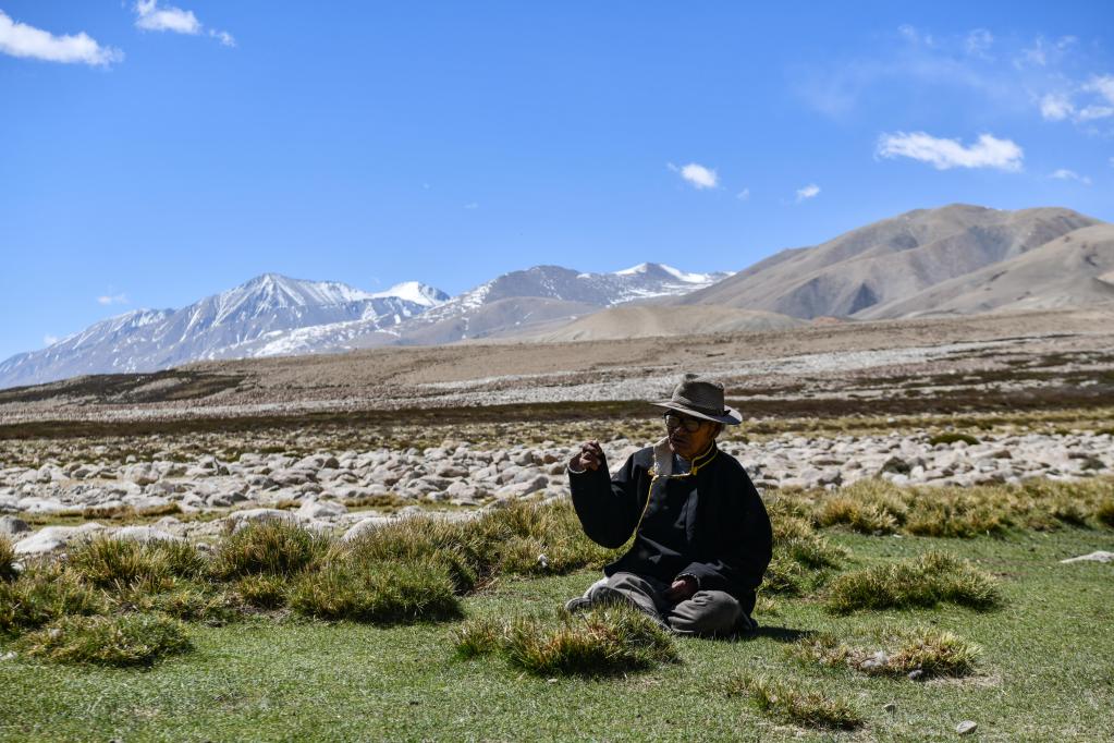 仁增旺扎老人在石窟旁的空地上吃午飯(5月26日攝)。新華社記者 晉美多吉 攝