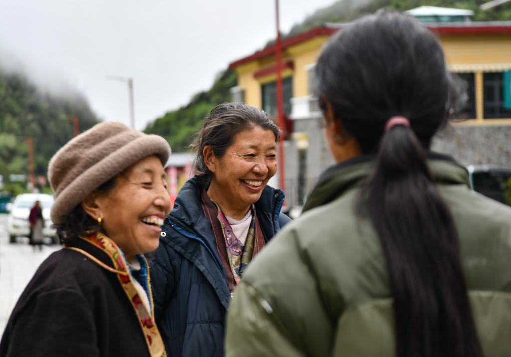 卓嘎(左一)、央宗(左二)在玉麥鄉(xiāng)街頭和街坊聊天(6月10日攝)。新華社記者 晉美多吉 攝