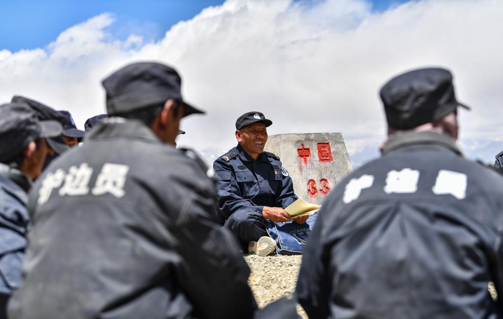 在33號界碑處,護邊隊在隊長的帶領(lǐng)下開展學(xué)習(xí)(6月2日攝)。新華社記者 晉美多吉 攝