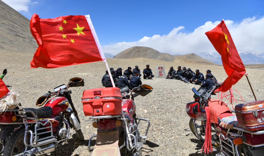 在33號界碑處,護邊隊在隊長石角(右二)的帶領(lǐng)下開展學(xué)習(xí)(6月2日攝)。新華社記者 晉美多吉 攝