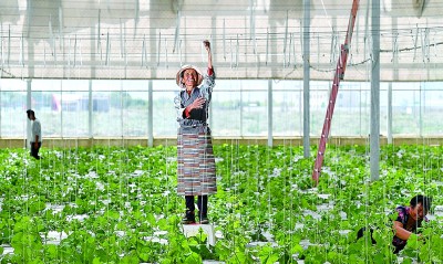 工作人員在山南市扎囊縣阿扎鄉(xiāng)的玻璃溫室里養(yǎng)護旗云瓜。湖南省第九批援藏工作隊引進智慧農(nóng)業(yè)和戈壁田園植物工廠項目,在荒地建起有機果蔬基地200多畝。攝影:辜鵬博(湖南日報攝影記者)