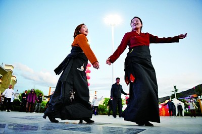 市民在湖南援建的山南市體育館廣場上跳鍋莊舞。攝影:辜鵬博(湖南日報攝影記者)