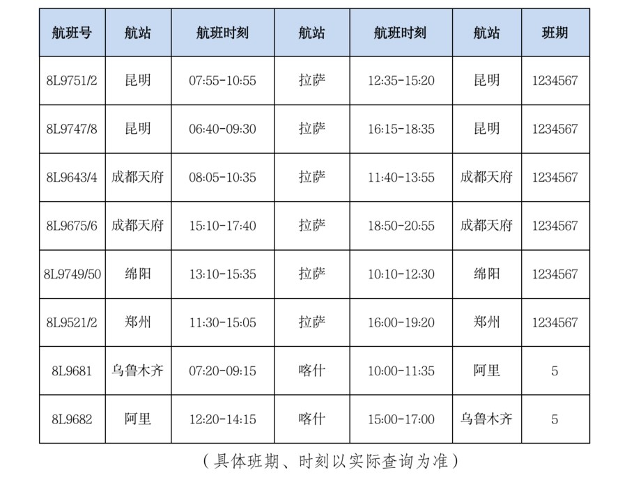 據(jù)了解,祥鵬航空“阿里—喀什—烏魯木齊”獨飛航線于6月23日復航,每周五執(zhí)飛一班;“拉薩—成都天府”航線于7月1日起升級為空客A330寬體機執(zhí)飛。