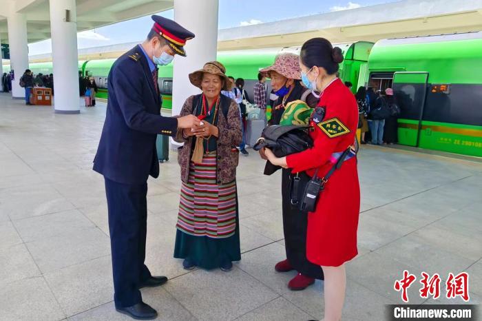 圖為日喀則火車站工作人員服務旅客。拉薩車務段 供圖
