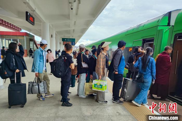 圖為暑運期間,旅客在日喀則火車站乘坐高原復興號。拉薩車務段 供圖