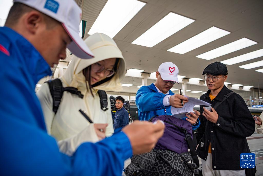 7月24日,在拉薩火車(chē)站,工作人員為抵達(dá)拉薩的志愿者登記信息。新華社記者 孫非 攝