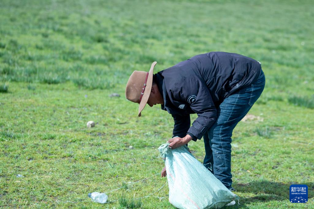 8月11日,次扎達在轉換牧場時撿拾生活垃圾。新華社發(fā)(旦增努布攝)