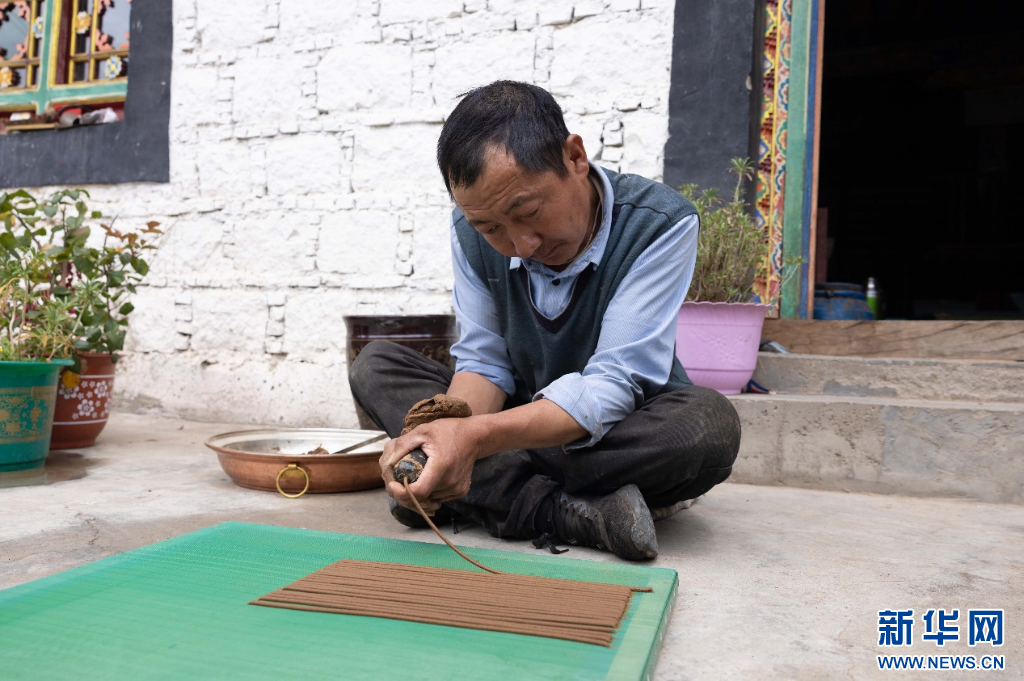 工作時(shí),格桑次仁會(huì)盤(pán)腿坐于門(mén)前,熟練地揉搓著盆中的香泥,待其成型后再迅速放入帶孔的牛角中,用靈巧的手指擠出一道道筆直的線(xiàn)條,一根根均勻的藏香便呈現(xiàn)在人們的眼前。經(jīng)過(guò)晾曬成型之后,這些藏香將會(huì)被送至附近的大小寺廟,或是通過(guò)電商渠道發(fā)往全國(guó)各地。