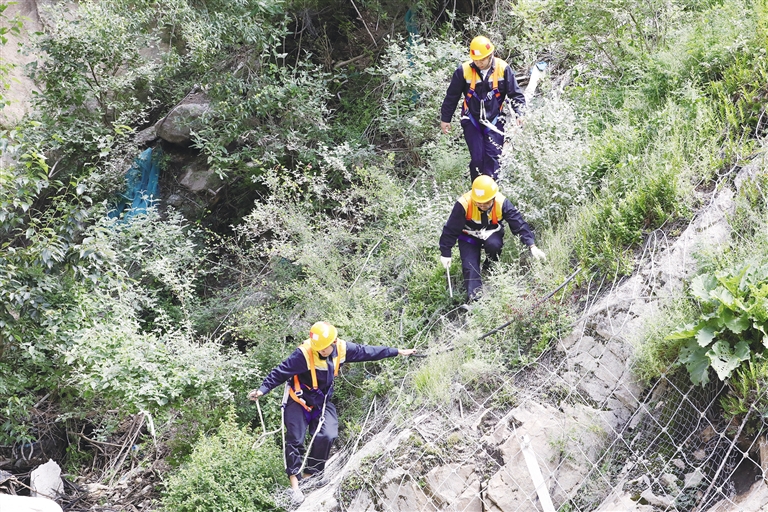“剛下過(guò)雨,地面濕滑,大家一定要抓牢踩實(shí),防止滑倒。”走在最前面的工長(zhǎng)東生瑞轉(zhuǎn)身大聲提示大家,他的聲音隨風(fēng)在山谷間回蕩。在一段陡峭的山路旁,來(lái)自東北的“00后”小伙杜猛發(fā)現(xiàn)一塊大石頭下面有空虛的跡象,他立即向東生瑞匯報(bào),并拿出自噴漆,在石頭周?chē)鷩娚嫌浱?hào)和巡視日期。