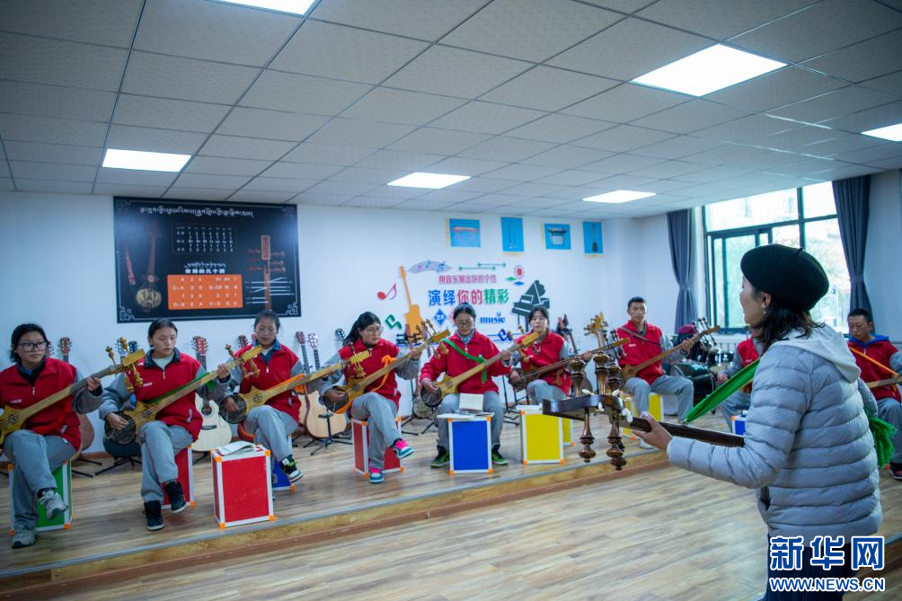 圖為那曲市高級(jí)中學(xué)學(xué)生在彈奏扎念琴(9月5日攝)。新華網(wǎng) 旦增努布 攝