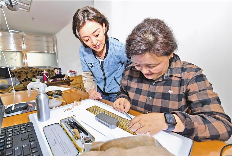 西藏自治區(qū)圖書館古籍保護中心工作人員在進行古籍粘貼修復。唐斌 攝