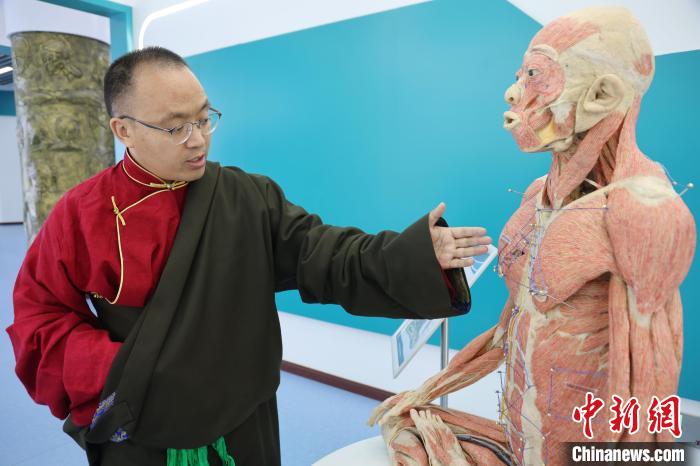 9月23日,青海大學(xué)藏醫(yī)學(xué)院副教授普措多杰介紹解剖姿勢(shì)塑化造型。 中新社記者 張?zhí)砀?攝