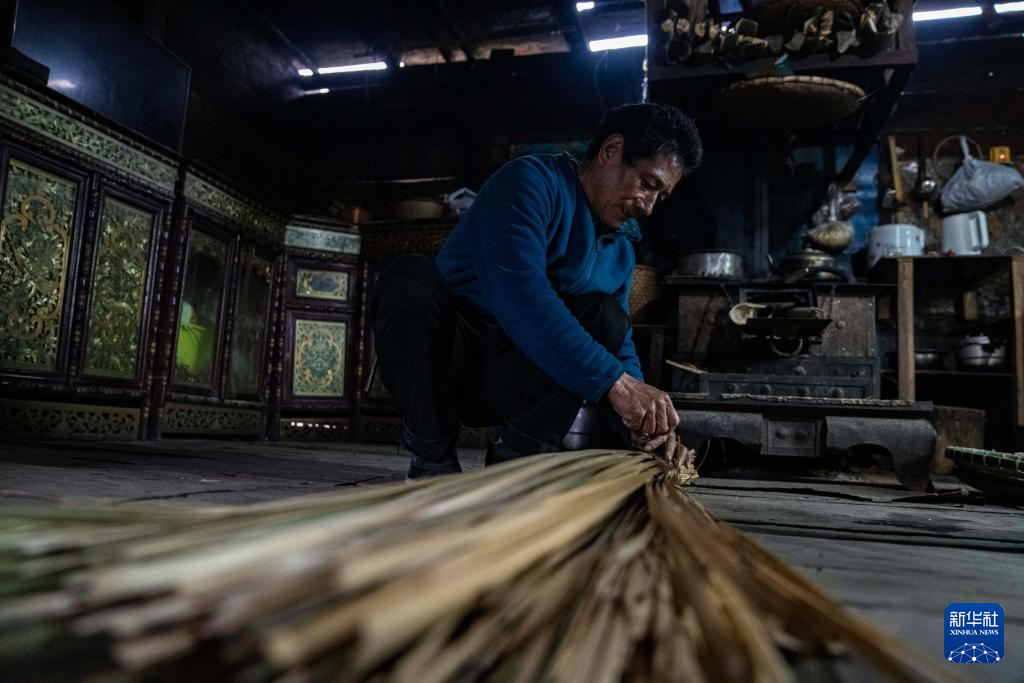 在西藏墨脫縣背崩鄉(xiāng)巴登村,一名村民在整理藤竹條(10月11日攝)。新華社記者 孫非 攝