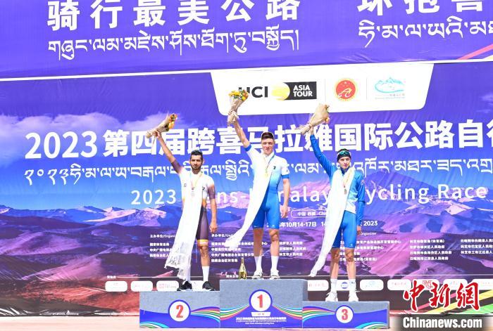 10月14日,第一賽段(林芝)前三名站上領(lǐng)獎臺。中新社記者 趙朗 攝