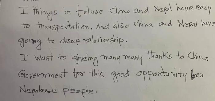 國(guó)之交在于民相親,民相親在于心相通。采訪過后,這位老人認(rèn)認(rèn)真真地用英文寫下一封信并交給中新網(wǎng)記者。他說:“我相信,未來中尼交通將更加便利,兩國(guó)情誼將更加深厚。我非常、非常地感謝中國(guó)政府,為尼泊爾人民帶來了這些大好機(jī)會(huì)?!?/p>