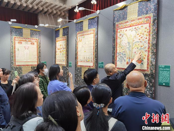 11月1日,“藏醫(yī)唐卡精品展”在中國(guó)藏學(xué)研究中心西藏文化博物館正式開(kāi)幕。圖為講解員為嘉賓介紹藏醫(yī)唐卡展品。 記者 徐雪瑩 攝