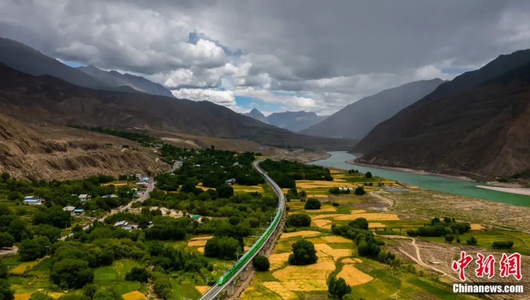 川藏鐵路拉林段高原復興號通過西藏林芝朗縣堆巴磄。魏方合 攝