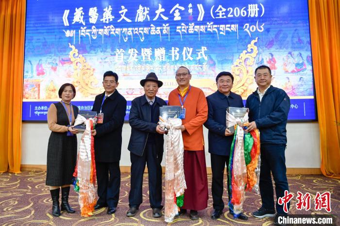 圖為《藏醫(yī)藥文獻(xiàn)大全》贈(zèng)書儀式現(xiàn)場(chǎng)。貢嘎來松 攝