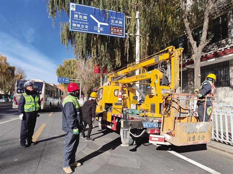 “結合拉薩市城鄉(xiāng)環(huán)境綜合大整治,我們在開展道路交通整治行動中,積極聯(lián)合園林部門對于道路兩旁樹枝遮擋交通信號燈、指示標牌和電子監(jiān)控探頭等問題進行全方位整改,此次整改點位155處,確保轄區(qū)道路交通安全暢通。在此,提醒廣大交通參與者,遇到修剪樹枝車輛,請減速慢行,確保交通安全。”拉薩市公安局交警支隊城南大隊副大隊長張浩表示。