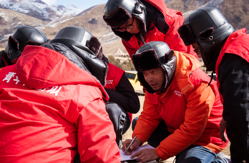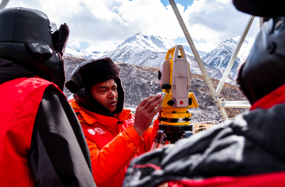 索縣榮布至丁青縣巴達35千伏線路工程負責(zé)人黃小洪在現(xiàn)場開展線路弧測量教學(xué)。(趙清鵬 攝)