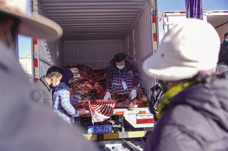 “這里的牦牛肉36元一斤,而市面上的其他牦牛肉要40多元一斤,買上百斤的牦牛肉算下來能便宜不少錢?!崩_市民次仁告訴記者,“我今天打算買一只牛前腿和一只牛后腿,回家做風(fēng)干肉。如果想買現(xiàn)成的風(fēng)干牦牛肉,我看現(xiàn)場的合作社銷售點也有賣,挺方便的。”