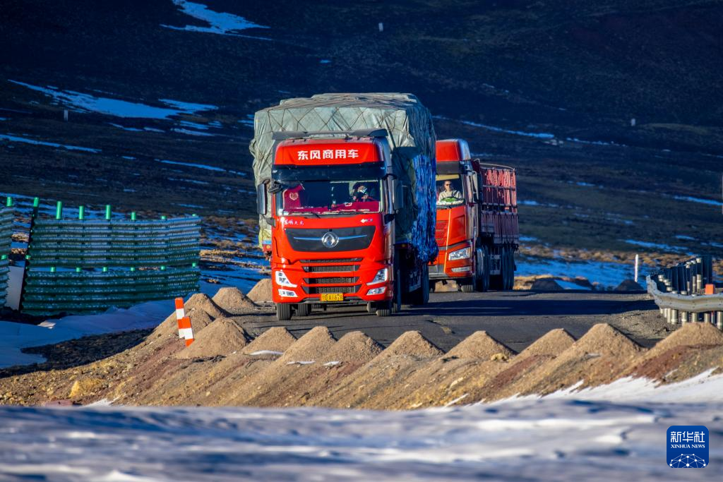 運載著申扎縣供銷合作社為偏遠(yuǎn)鄉(xiāng)鎮(zhèn)果蔬配送試點項目從西寧采購的50噸新鮮果蔬的貨車經(jīng)過唐古拉山口(1月3日攝)。新華社記者 曹檳 攝