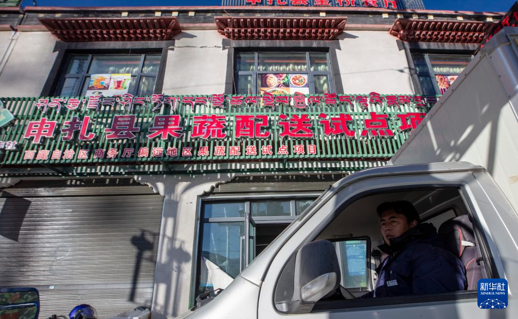 申扎縣供銷合作社的配送員巴拉從縣城總店出發(fā),為馬躍鄉(xiāng)貝嘎四村偏遠(yuǎn)鄉(xiāng)鎮(zhèn)果蔬配送試點項目直銷點運送新鮮果蔬(1月5日攝)。新華社記者 姜帆 攝