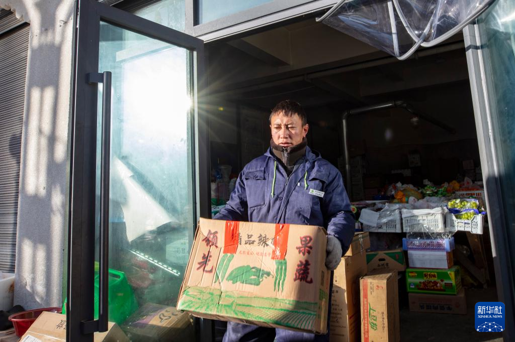 申扎縣供銷合作社員工在拉薩為偏遠(yuǎn)鄉(xiāng)鎮(zhèn)果蔬配送試點項目的貨車上貨(1月2日攝)。新華社記者 姜帆 攝