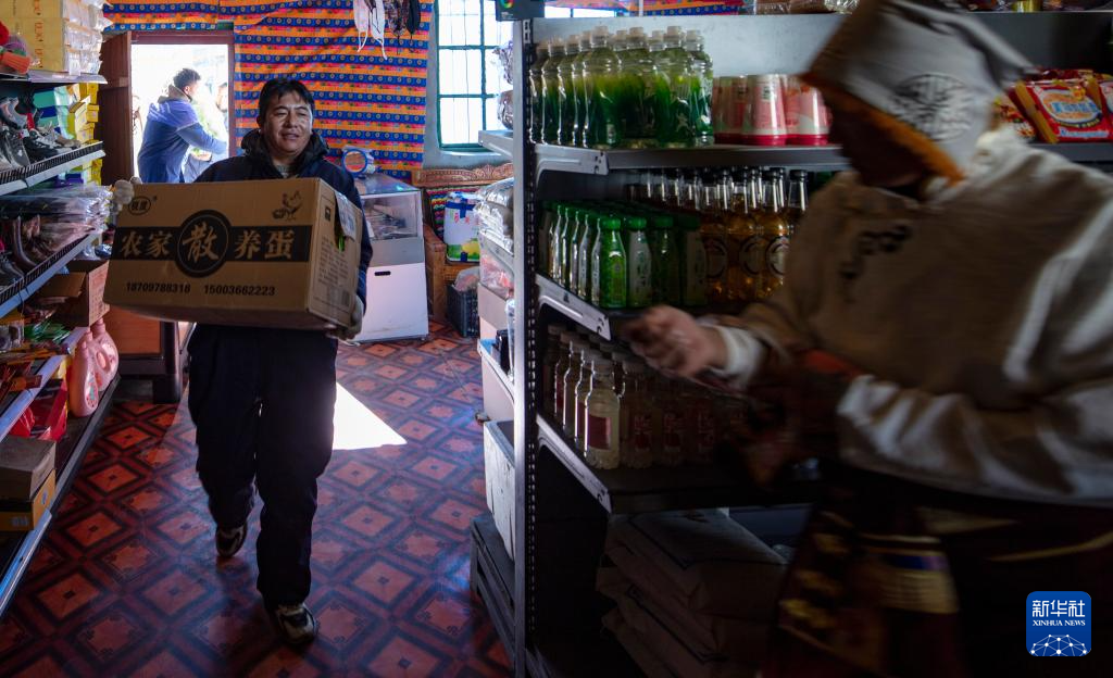 申扎縣供銷合作社的配送員次仁桑珠在縣城總店為馬躍鄉(xiāng)貝嘎四村偏遠(yuǎn)鄉(xiāng)鎮(zhèn)果蔬配送試點項目直銷點上貨(1月5日攝)。新華社記者 曹檳 攝