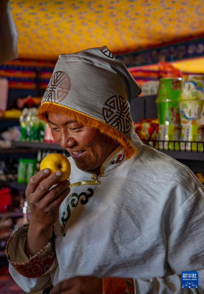 申扎縣馬躍鄉(xiāng)貝嘎四村偏遠(yuǎn)鄉(xiāng)鎮(zhèn)果蔬配送試點項目直銷點店主西熱加措拿起供銷合作社配送來的水果(1月5日攝)。新華社記者 姜帆 攝