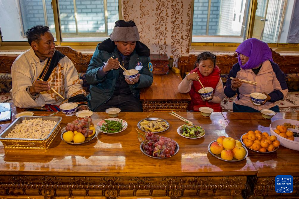 申扎縣馬躍鄉(xiāng)貝嘎四村村民次仁曲達(dá)(左一)家在吃飯,桌上的新鮮蔬菜和水果都是在村里的偏遠(yuǎn)鄉(xiāng)鎮(zhèn)果蔬配送試點項目直銷點采購的,由供銷合作社當(dāng)天配送而來(1月5日攝)。新華社記者 姜帆 攝