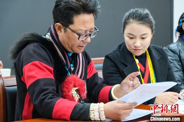 1月9日,西藏自治區(qū)兩會(huì)現(xiàn)場,兩位珞巴族政協(xié)委員林勇(左)和布姆曲珍進(jìn)行討論、交流。中新社記者 江飛波 攝