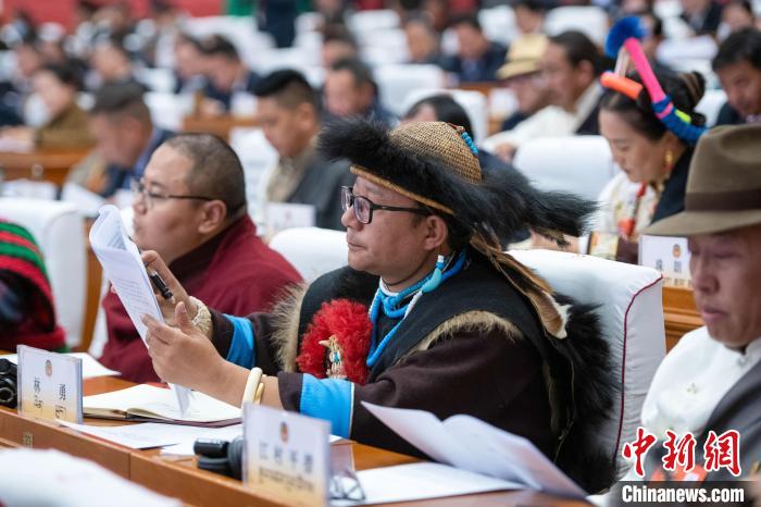 1月6日,西藏自治區(qū)兩會(huì)現(xiàn)場,珞巴族政協(xié)委員林勇(中間者)參會(huì)。中新社記者 貢嘎來松 攝