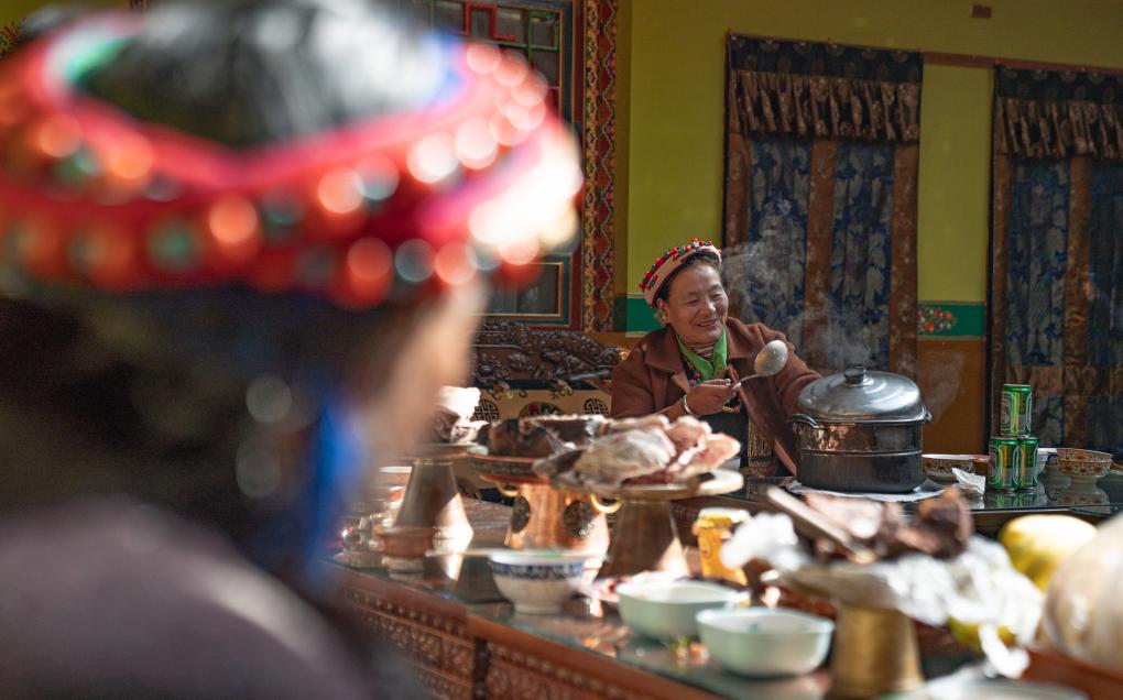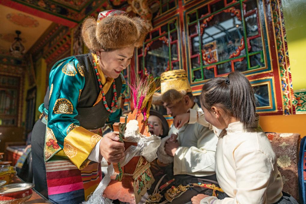 一家人按長幼次序落座,女兒次仁普尺逐一為大家獻上切瑪,這也是新年的重要儀式,寓意五谷豐登、六畜興旺、家和萬事興。
