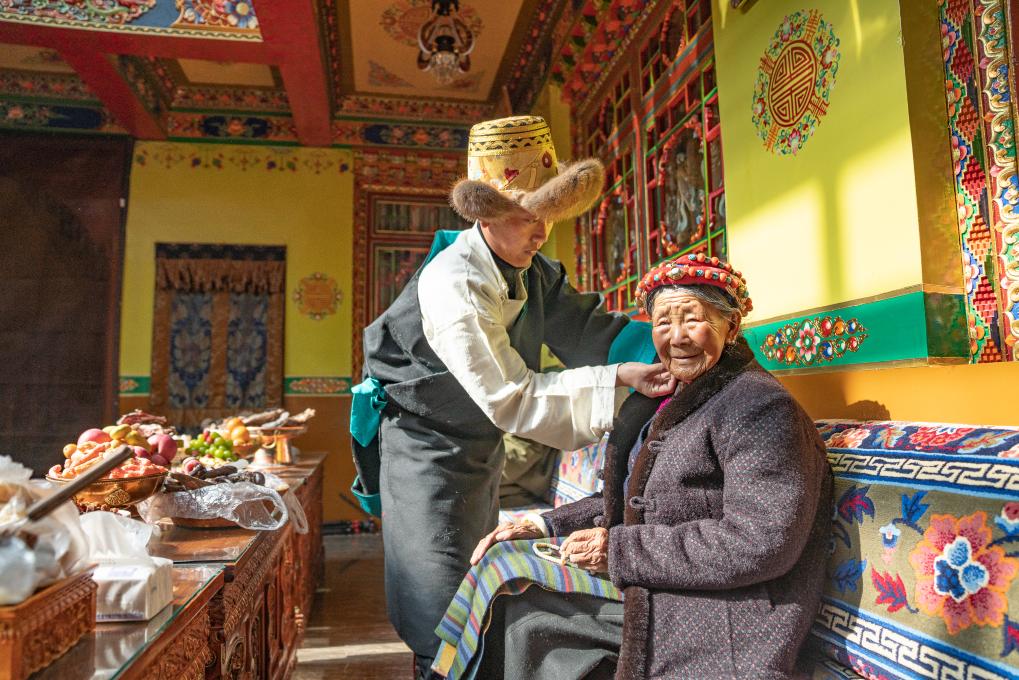 巴桑普尺今年59歲,育有兩女,小女兒在日喀則市人民醫(yī)院當(dāng)護士,大女兒在薩嘎縣工作,都已結(jié)婚生子。母親尼瑪除了聽力有些下降,身體硬朗。今年,在外的家人都悉數(shù)回家過年。