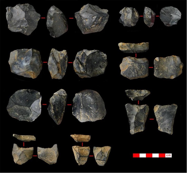 二號洞主探方T1發(fā)掘面積12平方米,已發(fā)掘至基巖,深度為2.2米。文化層底部距地表1.5米。主要文化遺存為石制品8136件、動物化石952件,此外還出土少量動物糞便和植物遺存。二號洞T1出土文化遺物主要是石核-石片技術(shù)生產(chǎn)的打制石器,原料以英安巖為主。石器組合完整,存在大量碎屑。石制品整體尺寸較小。單面向心剝片的小型盤狀石核獨具特色。石片形狀不規(guī)則。工具多以較厚的石片為毛坯,進行精致修理,刃緣較陡。器物類型豐富,包括刮削器、尖狀器、凹缺器、鉆器等。T1出土的動物化石破損風化比較嚴重,但初步觀察仍發(fā)現(xiàn)有與人類利用動物資源相關(guān)的切割痕跡。綜合石制品、動物化石、地層和出土物產(chǎn)狀分析,這里應為一處古人生活留下的原生堆積。根據(jù)初步的碳十四和光釋光測年結(jié)果,二號洞主文化層不晚于距今4.5萬年。