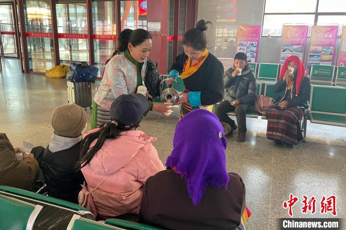 圖為春運首日,西藏日喀則火車站工作人員為旅客送上甜茶。金耀勛 攝