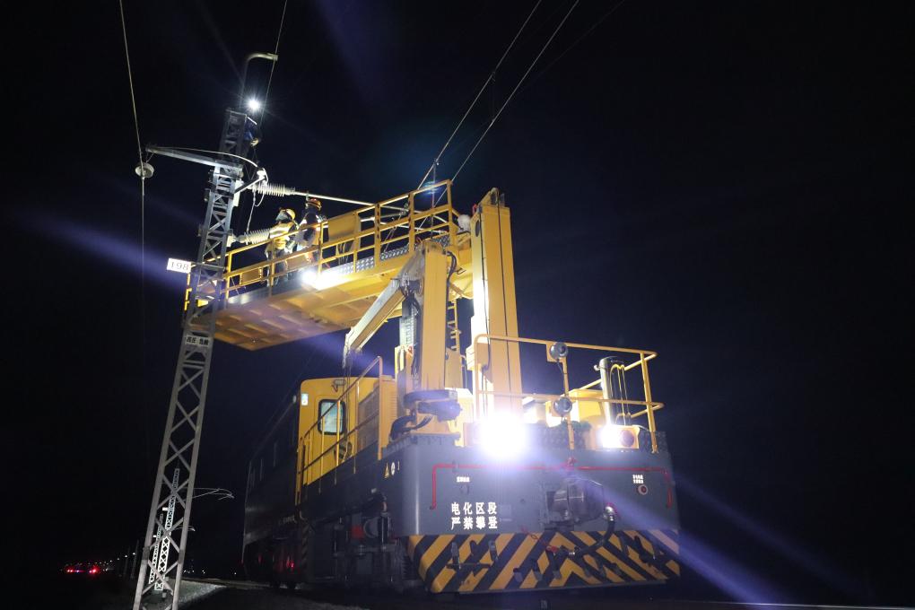 維護(hù)進(jìn)行時,專用的接觸網(wǎng)軌道作業(yè)車的兩節(jié)車廂緩緩解列,分別駛向全長13公里的接觸網(wǎng)作業(yè)區(qū)段兩端。拉薩的冬夜寒風(fēng)刺骨,溫度低至零下10攝氏度,工人們穿著絕緣鞋,將兩端接觸網(wǎng)接掛地線,正式開始作業(yè)。