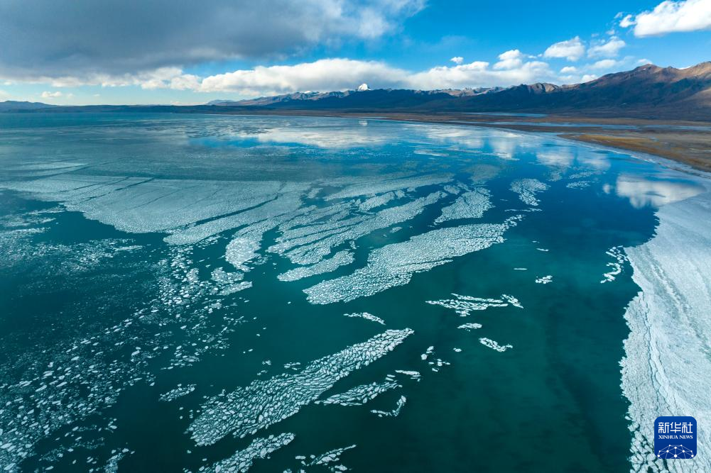 瑪旁雍錯(cuò)與遠(yuǎn)處的岡仁波齊峰(1月29日攝,無人機(jī)照片)。新華社發(fā)(旦增努布攝)