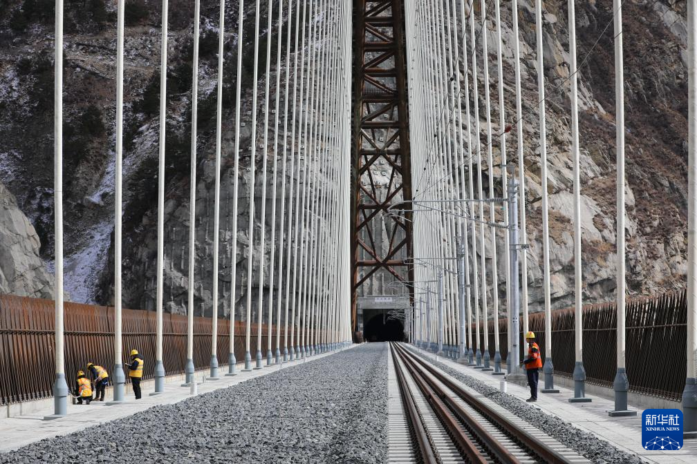 加查橋隧工區(qū)維護人員在檢查藏木特大橋的擋風板和吊桿(1月27日攝)。新華社記者 劉洲鵬 攝