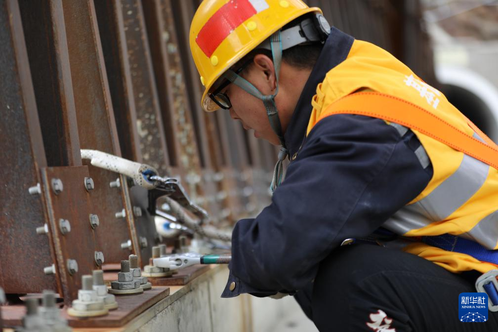 加查橋隧工區(qū)副工長張亮在檢查藏木特大橋螺絲銹蝕情況(1月27日攝)。新華社發(fā)(拉巴次仁攝)