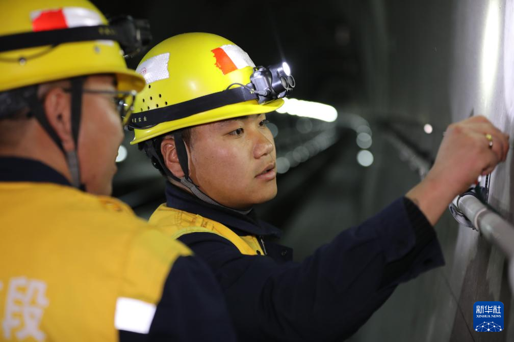 加查橋隧工區(qū)副工長東生瑞(左)檢查達嘎拉隧道狀況(1月27日攝)。新華社發(fā)(拉巴次仁攝)
