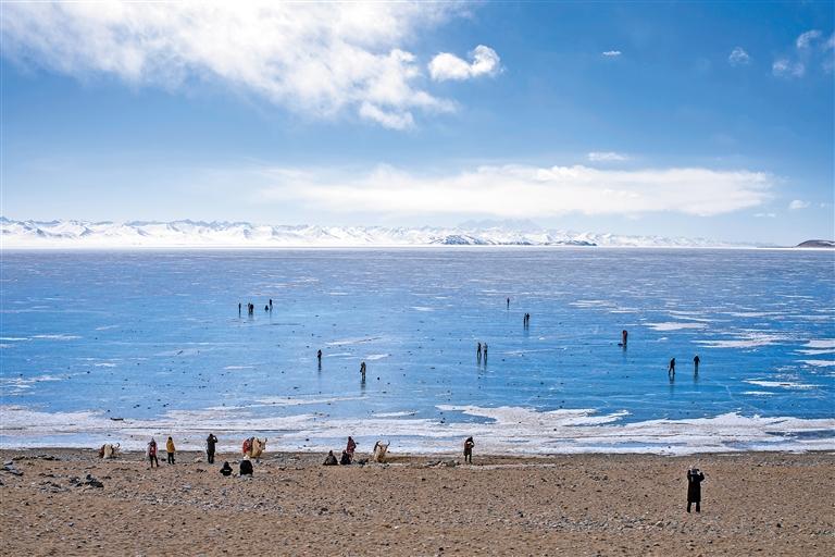 圖②:日前,游客在結(jié)冰的納木錯(cuò)湖面上游玩。新華社記者 孫非 攝
