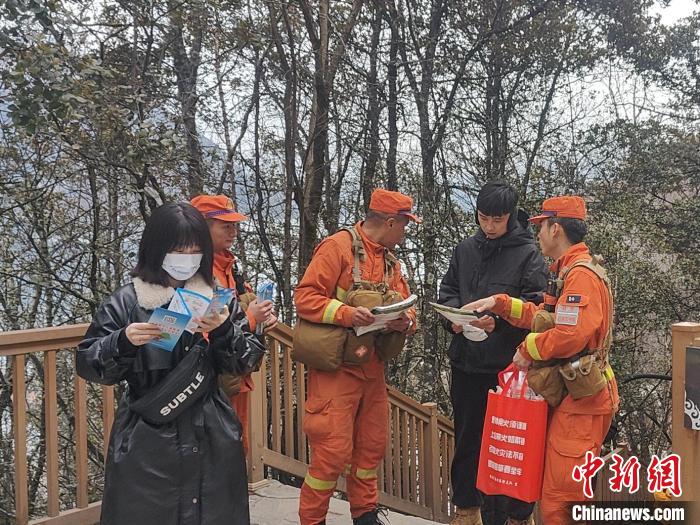 圖為森林消防員為進山入林游客發(fā)放防火宣傳手冊。張靖椿 攝