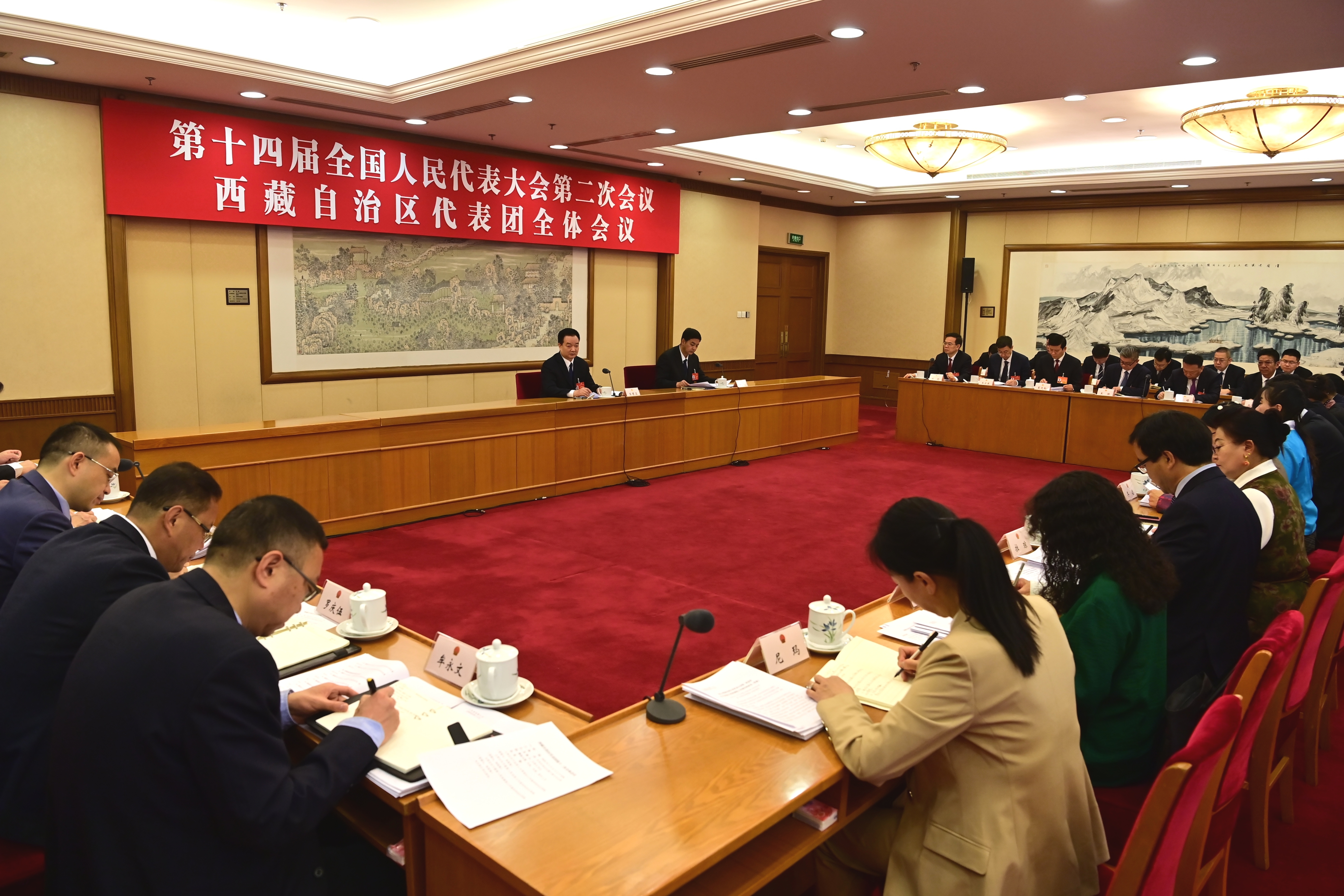 3月11日,西藏代表團舉行全體會議,審議關于全國人大常委會工作報告、最高人民法院工作報告、最高人民檢察院工作報告的決議草案。這是會議現(xiàn)場。記者 旦增西旦 攝