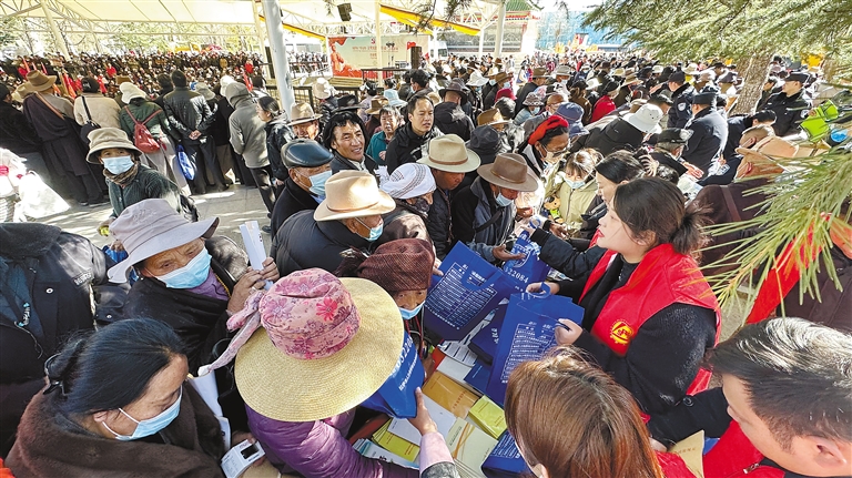 拉薩市直單位工作人員在宗角祿康公園為市民講解民生政策并發(fā)放宣傳手冊(cè)。