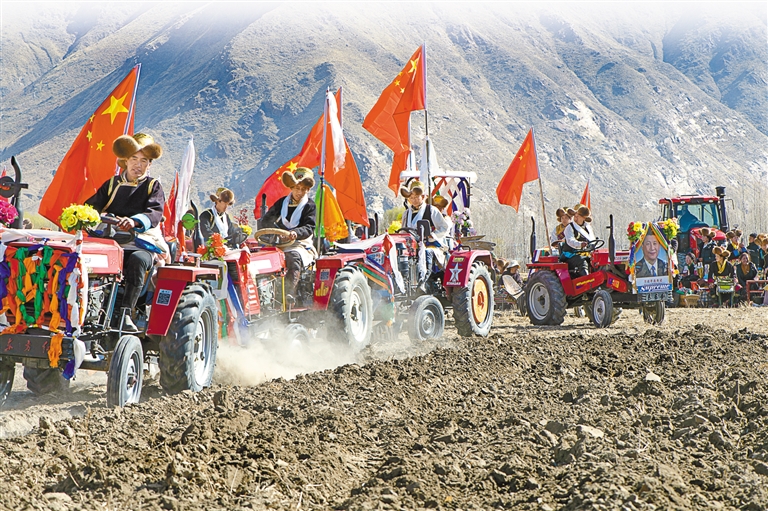 春耕春播儀式是西藏一年之中最隆重的農(nóng)事活動,這一天一定要用“二牛抬杠”犁耕法耕出新年第一犁。儀式上,村民們驅(qū)使著自家公牛緊跟拖拉機(jī),在承載著希望的田地上翻出一條條溝壟。隨后,姑娘們?nèi)鱿录挠杳篮米85姆N子,期盼全年風(fēng)調(diào)雨順、五谷豐登。