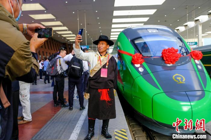 資料圖為2021年6月25日,西藏拉林鐵路開通運(yùn)營,拉薩曲水縣三有村村民次旦平措在復(fù)興號前拍照留念。江飛波 攝