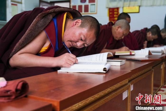 圖為3月28日,西藏佛學(xué)院20級尼眾(3)班學(xué)員在學(xué)習(xí)經(jīng)文。江飛波
